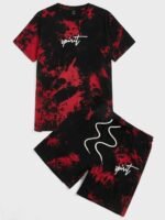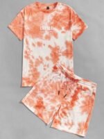 Polyester Summer Men Clothing Men Drop Shoulder Letter Pattern Tie Dye Tee & Drawstring Waist Track Shorts
